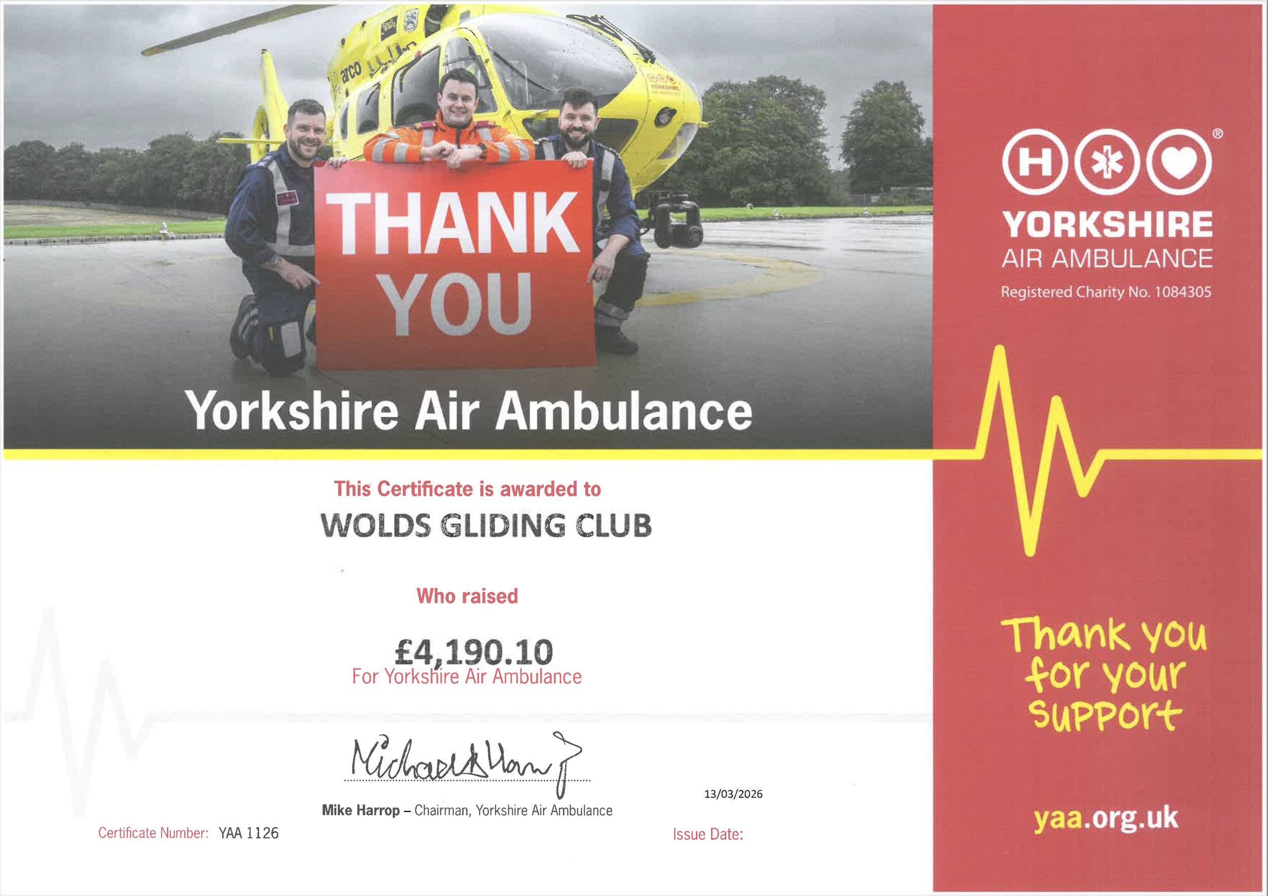 Wolds Gliding Web Master 24 March 2026 Wolds Gliding Club donate £4190.10 to Yorkshire Air Ambulance Wolds Gliding Web Master 24 March 2026 View fullsize